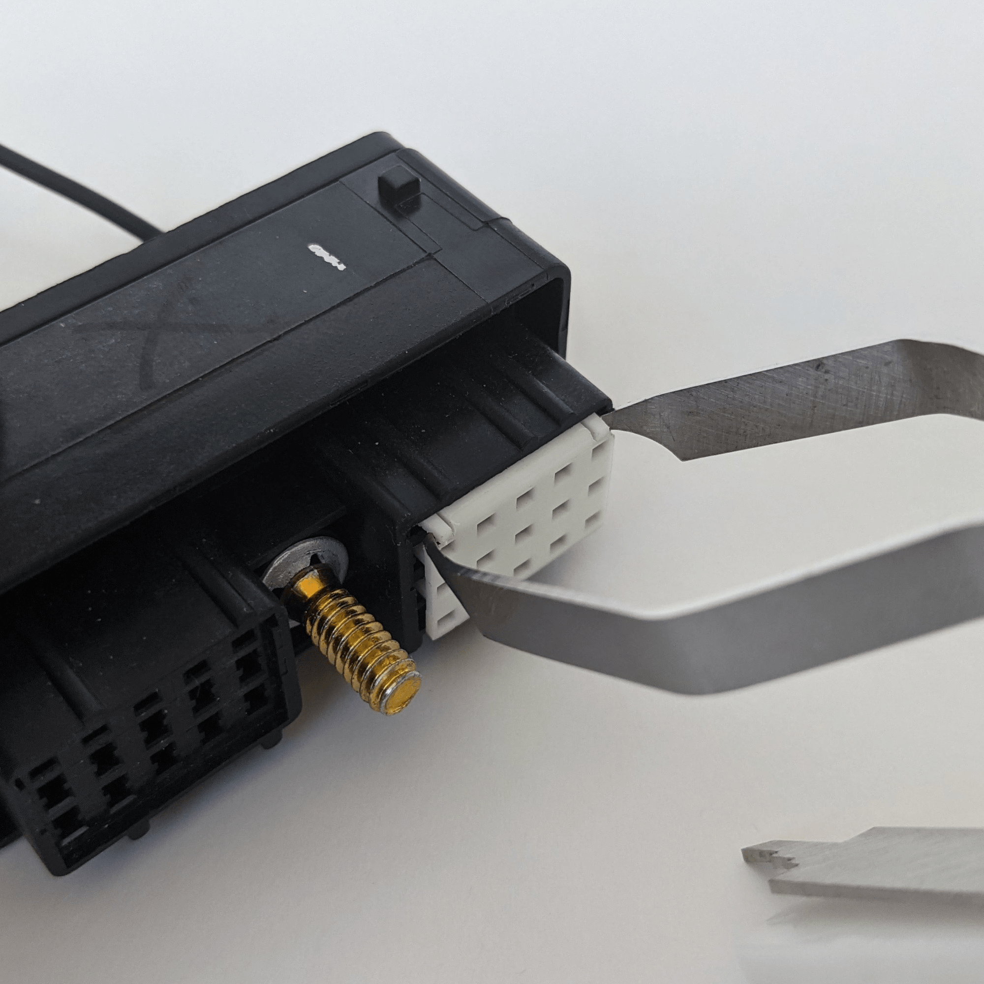 Step 1: Insert the depinning tool into the connector until the stop on the tool hits the front of the connector face. You may hear a click as the tool moves the tab.